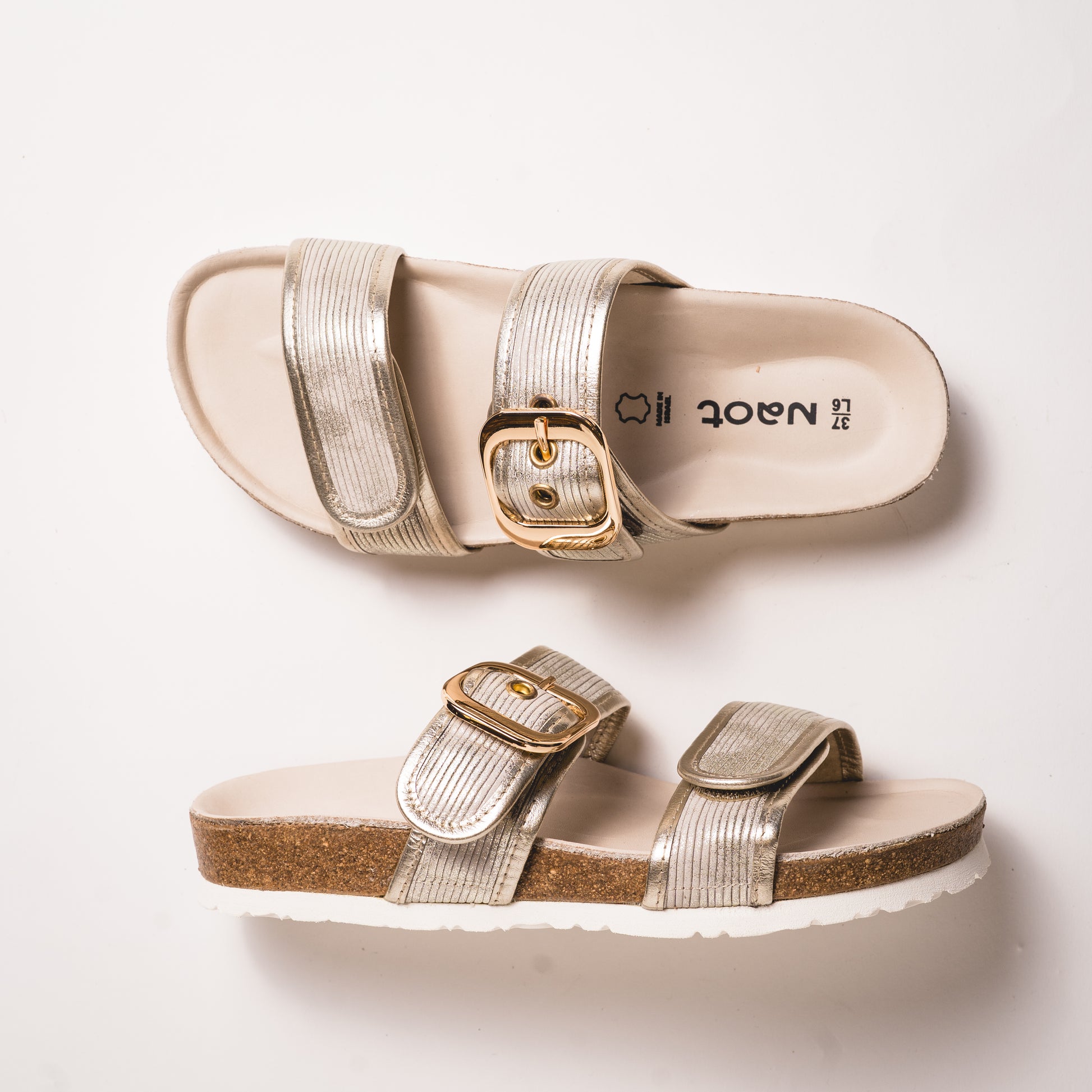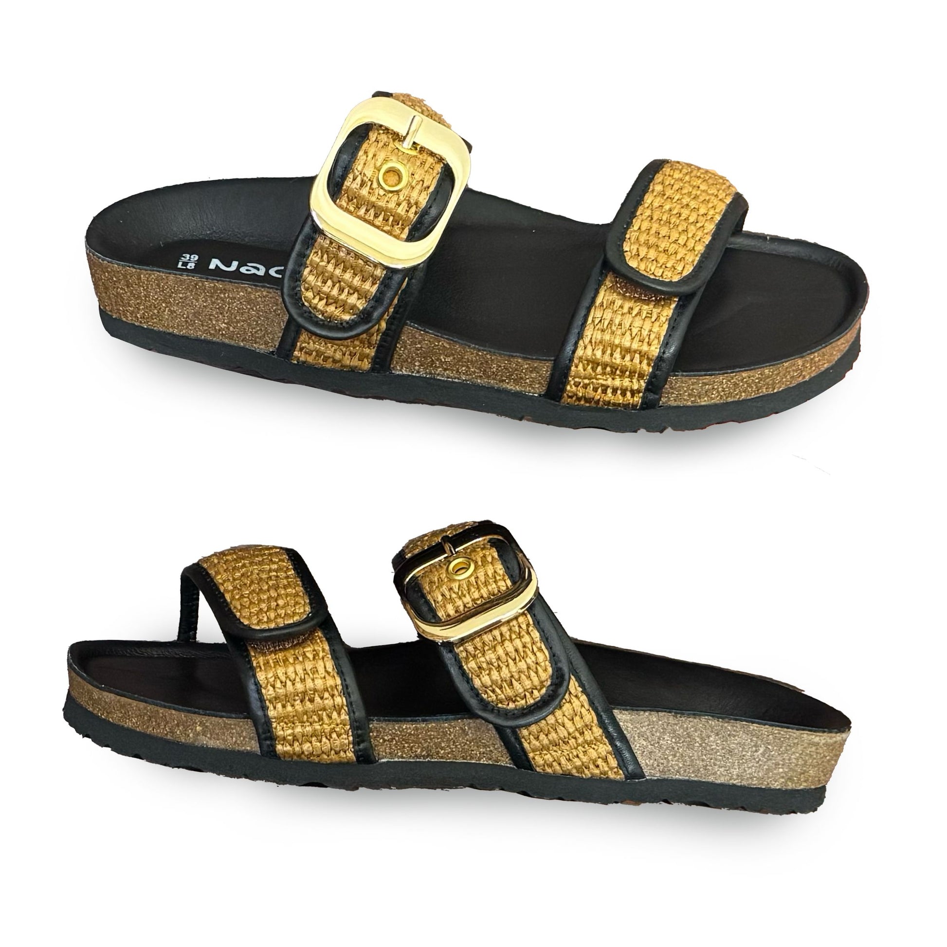 The Naot Nashville sandal is an easy, stylish slip-on sandal with an adjustable buckle, designed for comfort, versatility, and everyday wear. Available in classic white and black leather, a natural raffia-trimmed option, and a platinum finish with gold accents, this sandal adds personality to any outfit while staying timeless. Built on Naot’s signature cork and latex footbed, the Nashville offers excellent arch support, cushioning, and stability, making it a go-to walking and travel sandal you can wear all day.